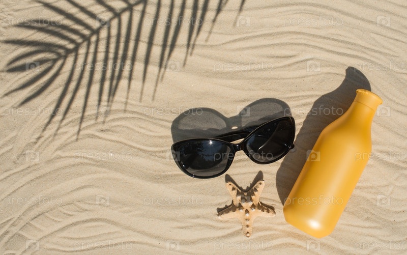 Фактор защиты от солнца, пальмовая ветвь, солнцезащитные очки и морские звезды на песке. Бутылка солнцезащитного крема. Концепция морского отдыха и ухода за кожей