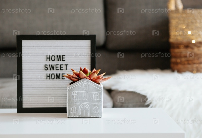 Знак с надписью «Дом сладкий дом» и сочный цветок в слайде в форме дома на кофейном столике в домашнем интерьере гостиной. Уютная осень, зима, весенняя концепция