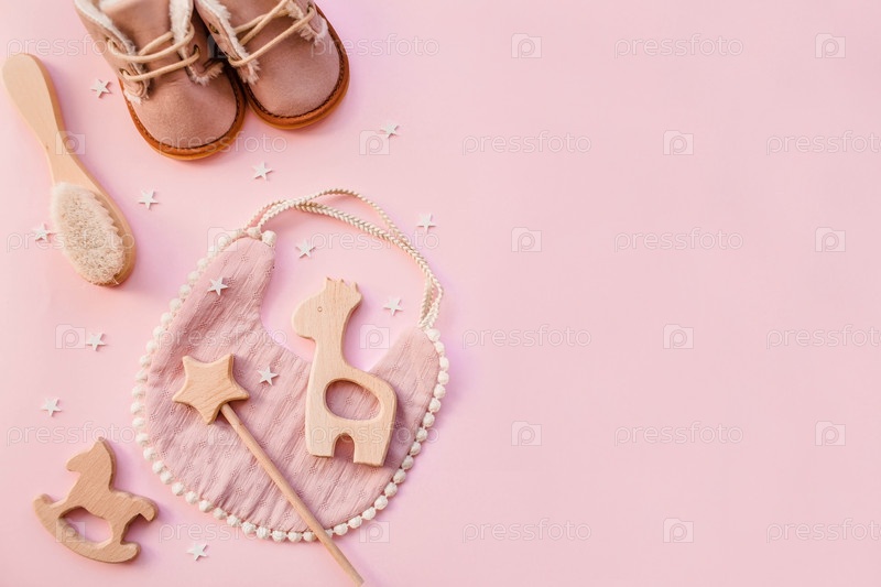 Биб и деревянные игрушки. Набор детских вещей и аксессуаров для девушки на пастельно-розовом фоне. Концепция детского душа. Модный новорожденный. Плоский лед, вид сверху