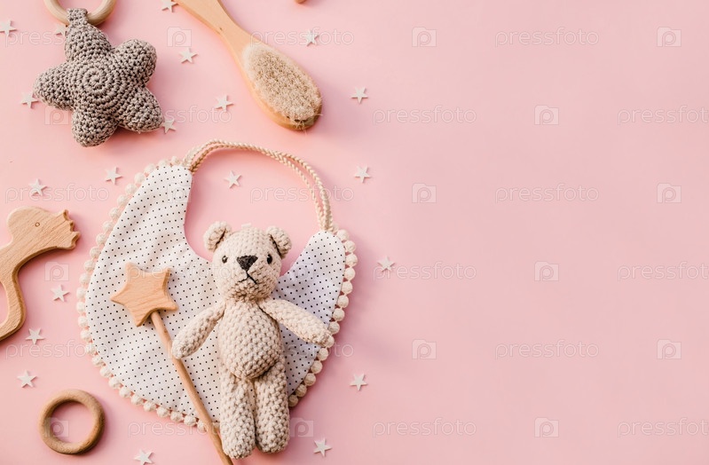 Биб и деревянные игрушки. Набор детских вещей и аксессуаров для девушки на пастельно-розовом фоне. Концепция детского душа. Модный новорожденный. Плоский лед, вид сверху