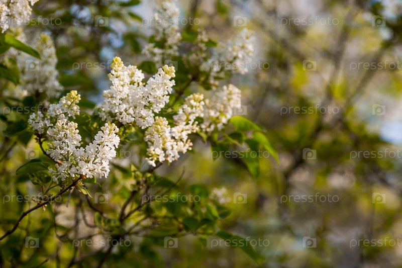 Знамя. Нежный белый сиреневый цветет в парке. Цветы на закате. Свет от солнца. Близко. Красивый боке на заднем плане
