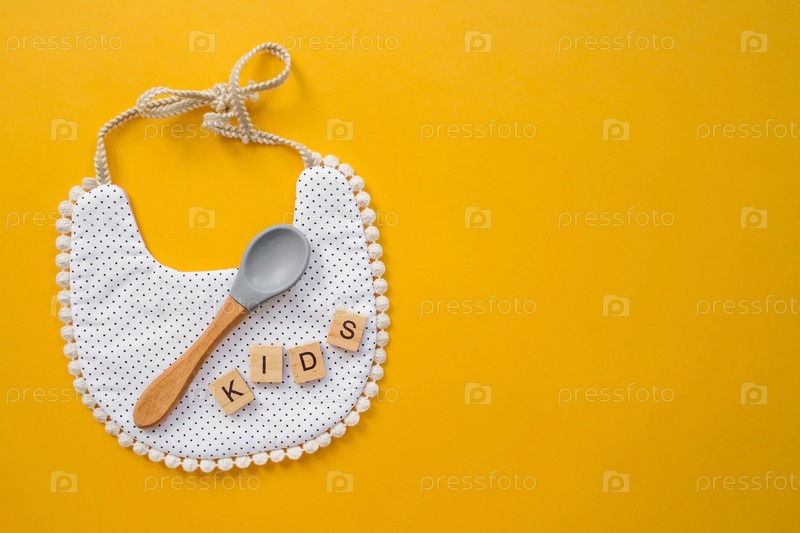 Ватная палочка, силиконовая ложка и слова, которые дети делали из деревянных кубиков на модном желтом фоне, лежали плоскими. Обслуживание детского питания
