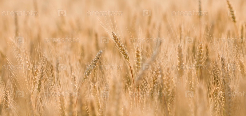 Золотые уши пшеницы на фоне созревающего поля. Сельскохозяйственный завод крупным планом. Концепция посадки и сбора богатого урожая. Сельский пейзаж на закате