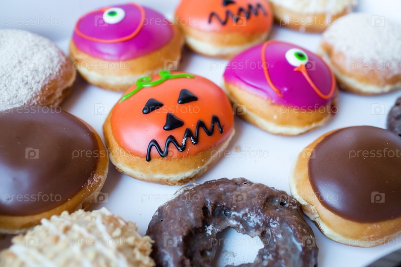 Вкусные, красочные пончики, украшенные к празднику Хэллоуин. Вид сверху