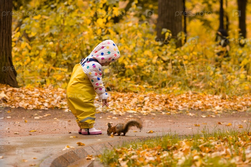 Девушка кормит белку в осеннем парке. Маленький ребенок в желтых брюках и дождевых сапогах наблюдает за диким животным в осеннем лесу с золотыми листьями. Дети играют на улице. Дети играют с домашними животными