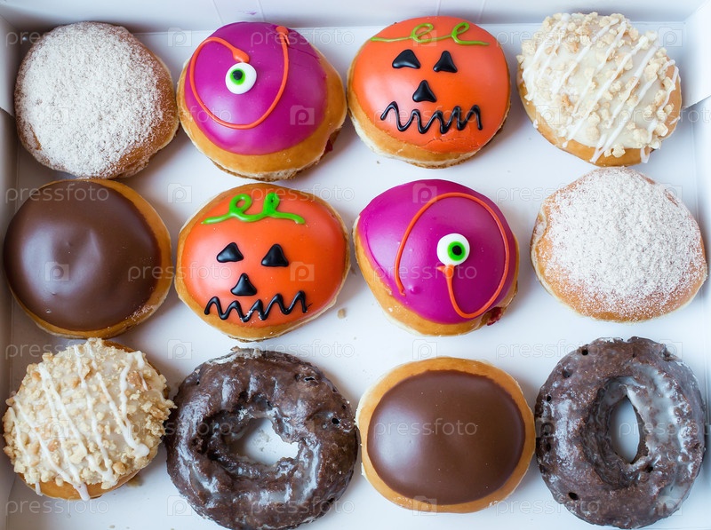 Вкусные, красочные пончики, украшенные к празднику Хэллоуин. Вид сверху