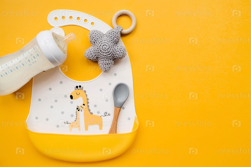 Обслуживание детского питания. Красочный силиконовый биб с жирафами, ложкой и молочной бутылкой на модном желтом фоне, плоско лежал