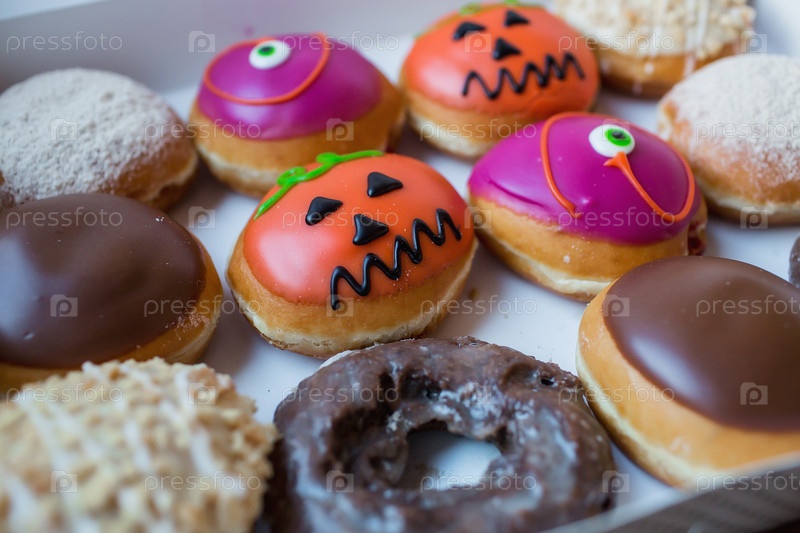 Вкусные, красочные пончики, украшенные к празднику Хэллоуин. Вид сверху