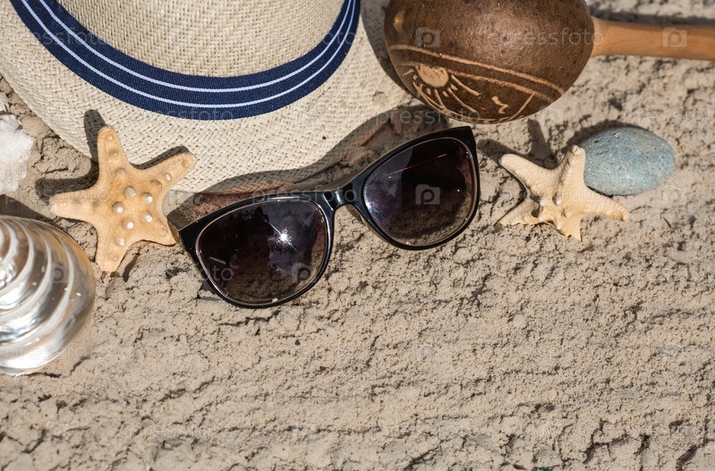 Концепция отдыха на море. Снаряды, соломенная шляпа, солнцезащитные очки на песке. Предыстория летних каникул с пространством для текста. Вид сверху