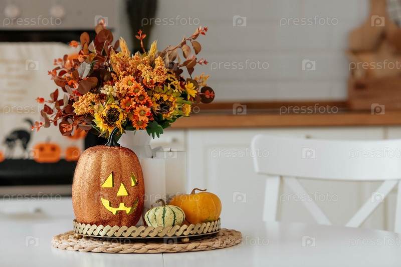 Ваза цветов, тыква и свечи на подносе. На заднем плане - интерьер белой кухни в стиле сканди. Концепция дома и комфорта. Осенний декор к празднику Хэллоуин