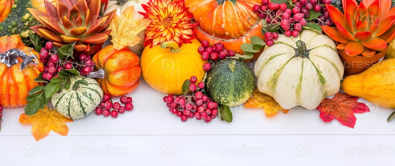 Богатый урожай. День Благодарения. Осенний фон красочных, декоративных тыкв, цветов и ягод горного пепла и суккулентов. Концепция праздника Хэллоуин