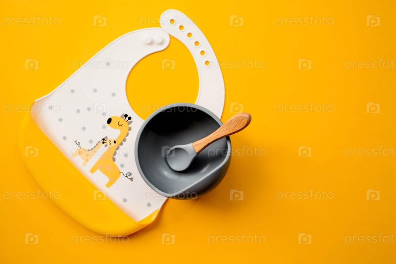Обслуживание детского питания. Красочный силиконовый биб с жирафами и ложкой на модном желтом фоне, плоский лежал