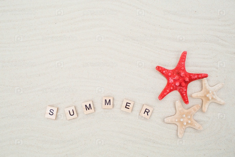 Концепция отдыха на курорте. Морские звезды, веревка и надпись «лето» сделаны из деревянных кубиков на песке. Предыстория летних каникул с пространством для текста. Вид сверху