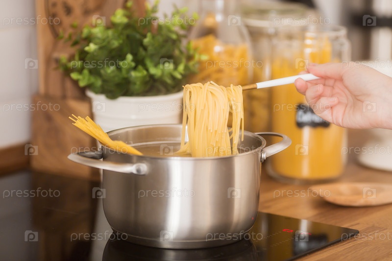 Процесс приготовления домашней итальянской пасты на кухне. Предыстория жизни. Спагетти на сковороде. Горизонтальный