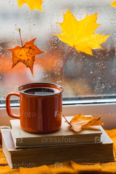 Осенний натюрморт с красивым боке. За окном кленовые листья и капли дождя бегут по стеклу. Чашка горячего чая, книги и вязаное одеяло у окна