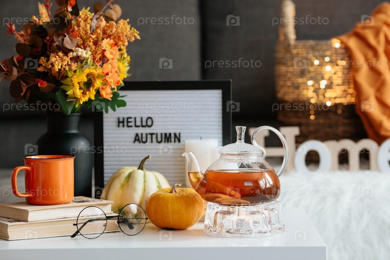 Натюрморт. Одеяло, тыквы, чайник и чашка чая на кофейном столике в домашнем интерьере гостиной. Уютная осенняя концепция