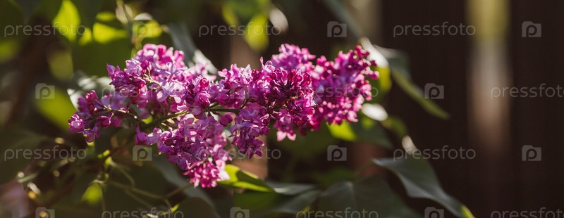 Знамя. Нежный фиолетовый сиреневый цветет в парке. Цветы на закате. Свет от солнца. Близко. Красивый боке на заднем плане