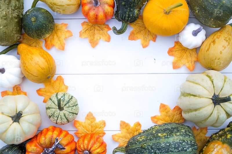 Урожай. День Благодарения. Осенний каркас из тыкв, листьев, ягод рябины и суккулентов на белом деревянном фоне. Концепция праздника Хэллоуин. Копия пространства для текста