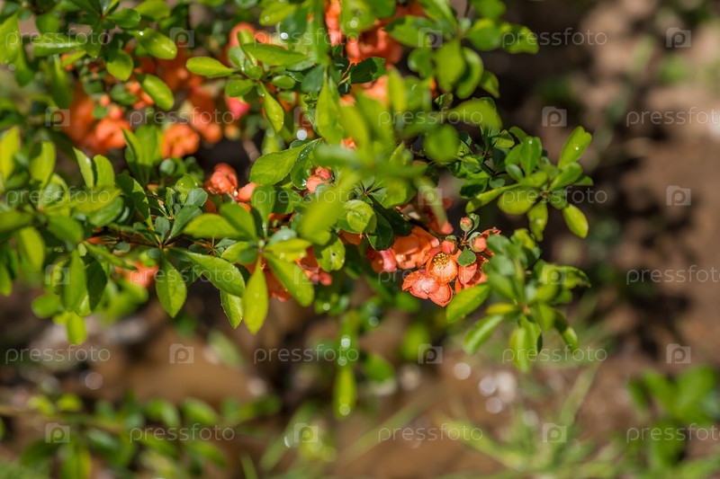 Оранжевые японские цветы айвы. Апельсиновые японские цветы весной. Большие цветы и почки оранжевой японской айвы на зеленом фоне. Копируйте пространство для текста