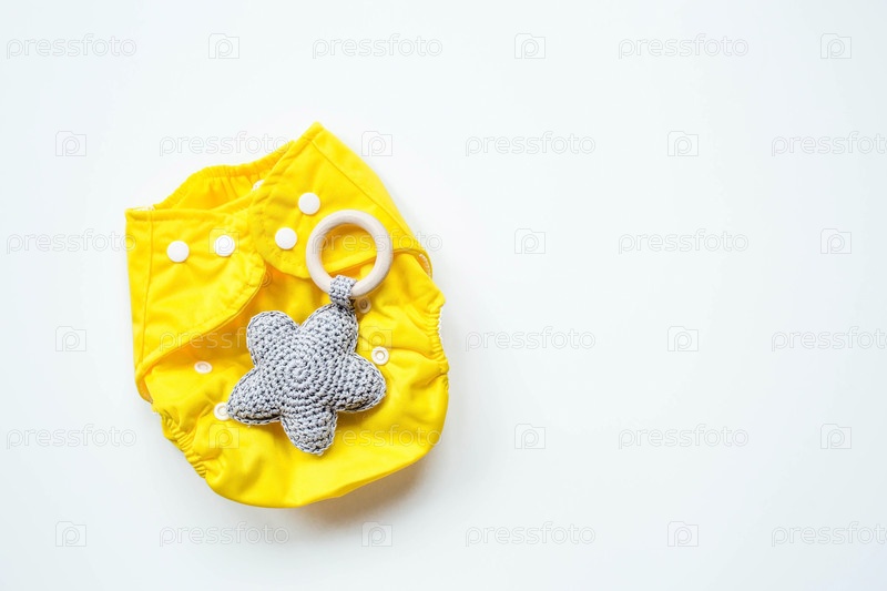 Стиральные, тканевые многоразовые экологически чистые подгузники и хлопковые игрушки для детей на белом фоне. Экологическая тенденция ухода за новорожденными