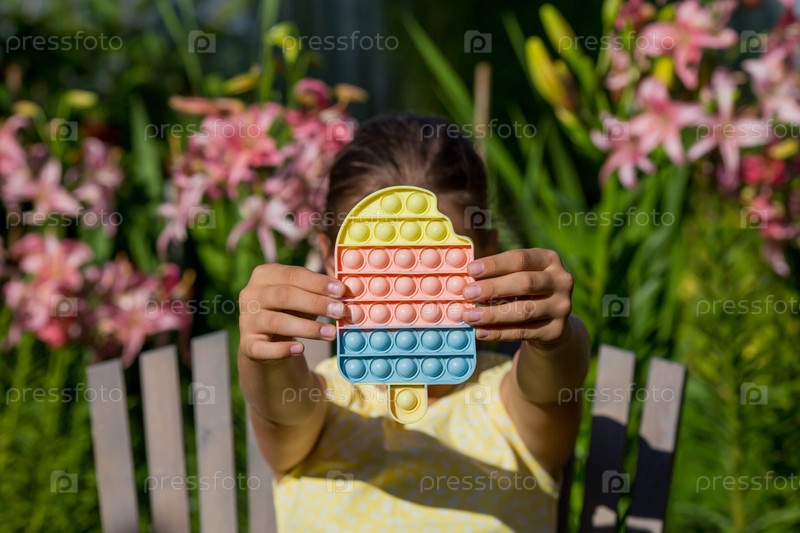 Ребенок с красочной игрой «Поп». Антистресс. Закрытие детских рук популярной поп-музыкой Это игрушка. Аутизм