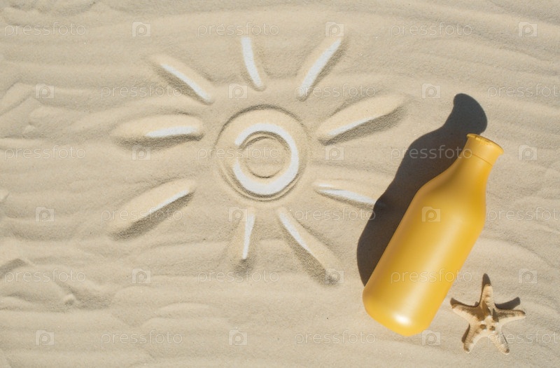 Фактор защиты от солнца и морские звезды на песке. Бутылка солнцезащитного крема. Концепция морского отдыха и ухода за кожей