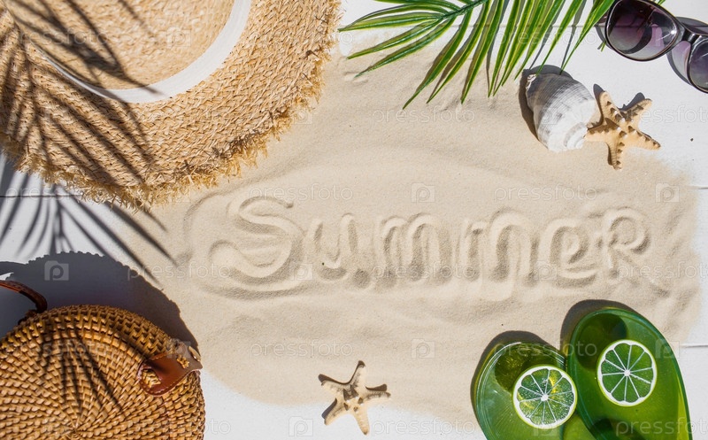 Концепция отдыха на море. Оболочки, соломенная шляпа, солнцезащитные очки и слово «лето» на белом песке. Предыстория летних каникул с пространством для текста. Вид сверху