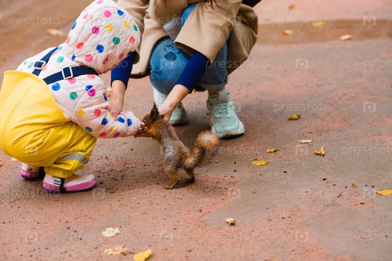 Девушка кормит белку в осеннем парке. Маленький ребенок в желтых брюках и дождевых сапогах наблюдает за диким животным в осеннем лесу с золотыми листьями. Дети играют на улице. Дети играют с домашними животными