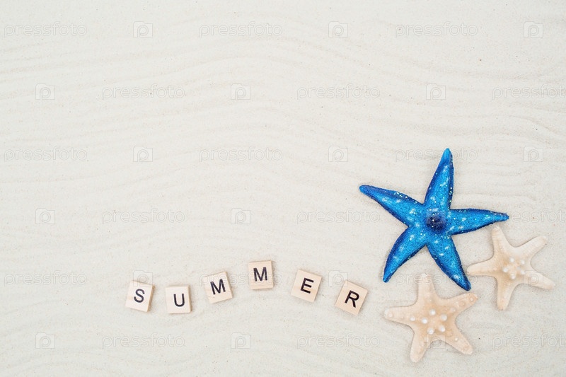 Концепция отдыха на курорте. Морские звезды, веревка и надпись «лето» сделаны из деревянных кубиков на песке. Предыстория летних каникул с пространством для текста. Вид сверху