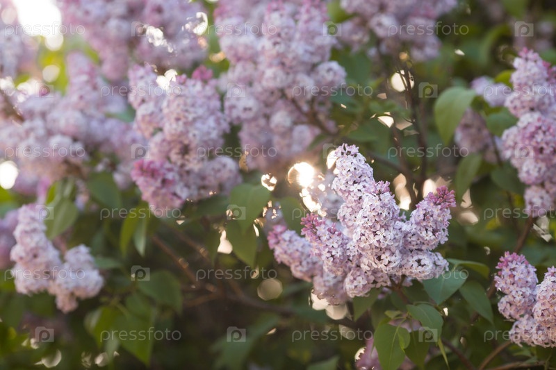Знамя. Нежный фиолетовый сиреневый цветет в парке. Цветы на закате. Свет от солнца. Близко. Красивый боке на заднем плане