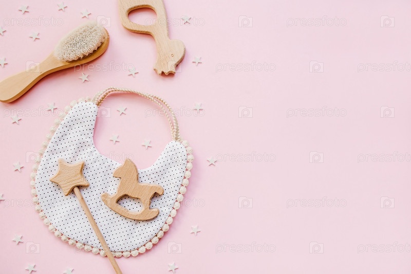 Биб и деревянные игрушки. Набор детских вещей и аксессуаров для девушки на пастельно-розовом фоне. Концепция детского душа. Модный новорожденный. Плоский лед, вид сверху