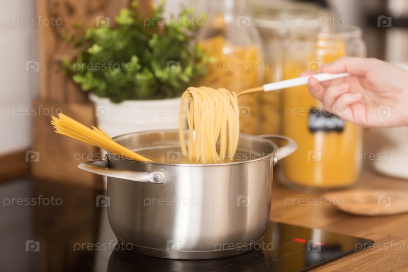 Процесс приготовления домашней итальянской пасты на кухне. Предыстория жизни. Спагетти на сковороде. Горизонтальный