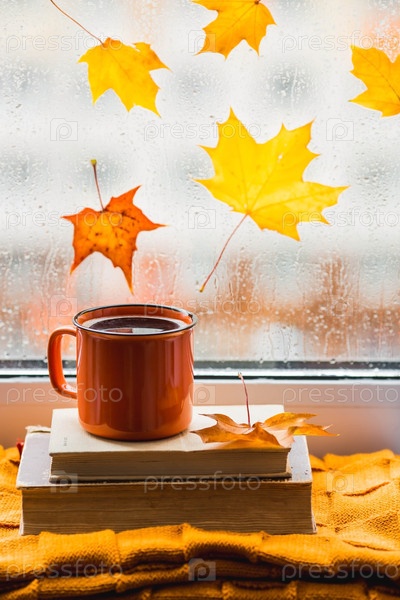 Осенний натюрморт с красивым боке. За окном кленовые листья и капли дождя бегут по стеклу. Чашка горячего чая, книги и вязаное одеяло у окна
