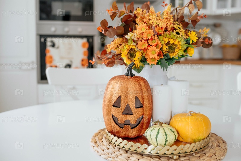 Ваза цветов, тыква и свечи на подносе. На заднем плане - интерьер белой кухни в стиле сканди. Концепция дома и комфорта. Осенний декор к празднику Хэллоуин