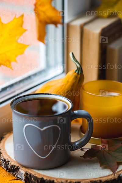 Осенний натюрморт с красивым боке. За окном кленовые листья и капли дождя бегут по стеклу. Чашка горячего чая, книги и вязаное одеяло у окна