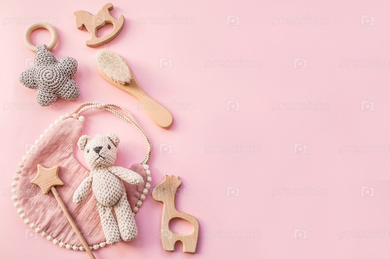 Биб и деревянные игрушки. Набор детских вещей и аксессуаров для девушки на пастельно-розовом фоне. Концепция детского душа. Модный новорожденный. Плоский лед, вид сверху