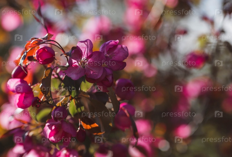 Макрофотография. Розовая декоративная яблоня цветет в прекрасном свете заката. Весна, обои природы. Цветущая яблоня в саду. Цветут розовые цветы на ветвях дерева