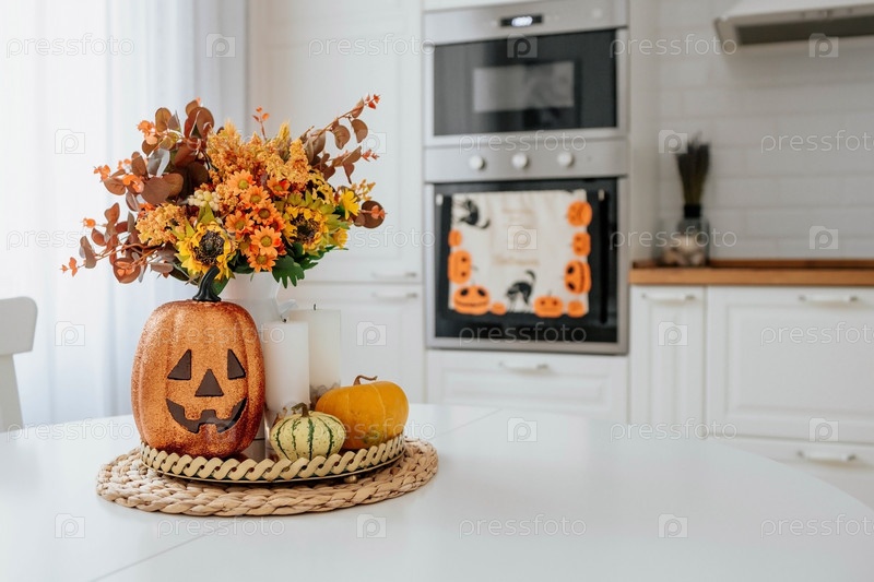 Ваза цветов, тыква и свечи на подносе. На заднем плане - интерьер белой кухни в стиле сканди. Концепция дома и комфорта. Осенний декор к празднику Хэллоуин