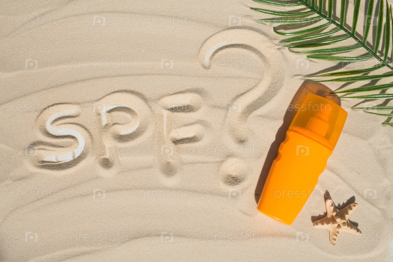Фактор защиты от солнца. Слово SPF написано на песке, а рядом с ним желтая бутылка солнцезащитного крема. Концепция морского отдыха и ухода за кожей