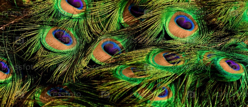 Красивая текстура павлиньих перьев крупным планом. Абстрактный красочный фон птичьего хвоста