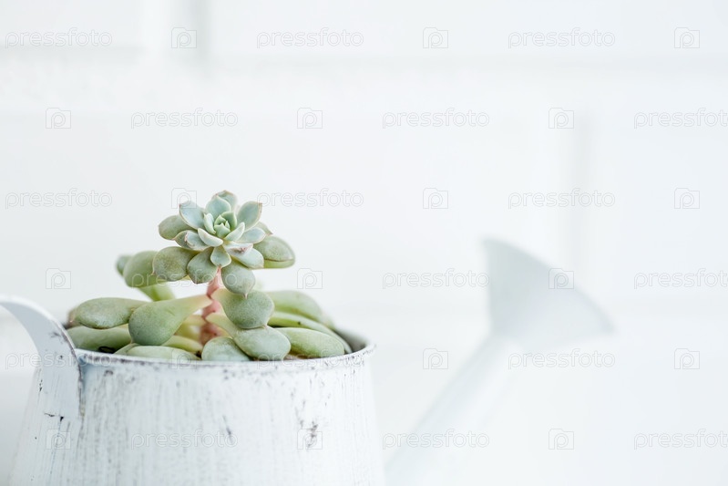 Группа миниатюрных сочных цветов в белом винтажном поливе. Закрытие зеленых кончиков Эчеверии. Цветущие домашние растения. Суккуленты