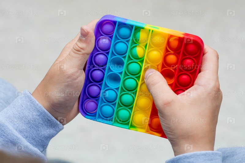 Ребенок с красочной поп-игрой. Антистресс. Снимок крупным планом детских рук, играющих с популярной поп-музыкой Это игрушка