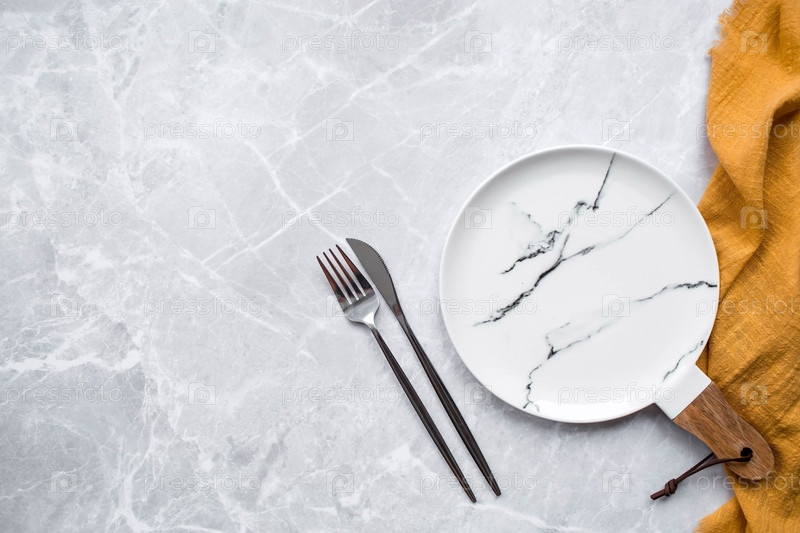 Знамя. Пустая керамическая мраморная плита с деревянной ручкой, вилкой, ножом и полотенцем на фоне серого бетонного стола. Пространство для текста. Концепция меню для кафе и ресторанов