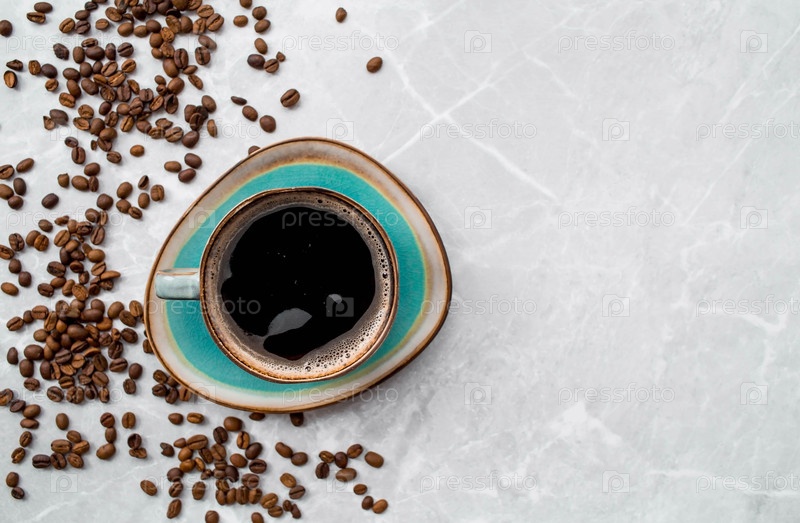 Кафе и рестораны. Кружка бодрящего черного кофе и кофейных зерен на сером мраморном фоне. Место для надписи. Концепция горячих напитков