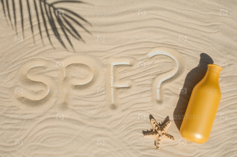 Фактор защиты от солнца. Слово SPF написано на песке, а рядом с ним желтая бутылка солнцезащитного крема. Концепция морского отдыха и ухода за кожей