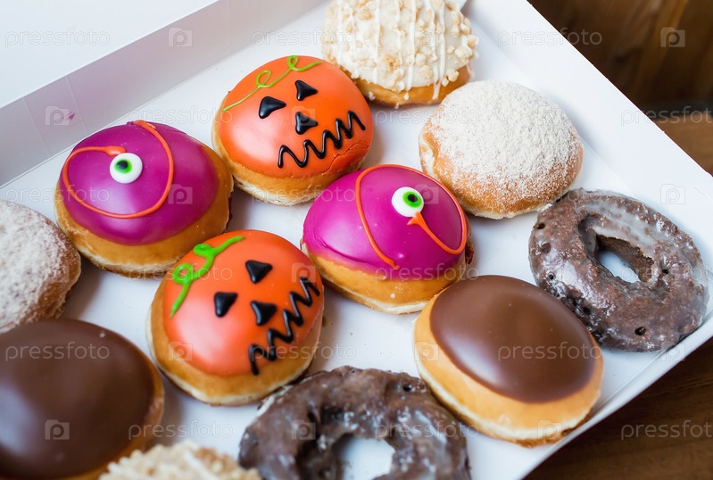Вкусные, красочные пончики, украшенные к празднику Хэллоуин. Вид сверху