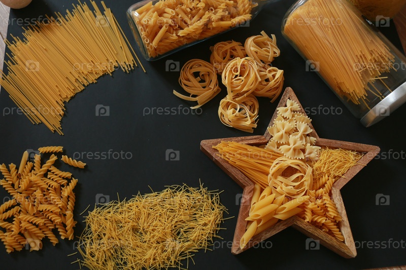 Кулинарный фон с различными видами макаронных изделий (спагетти, фузилли, фарфалл) на черном столе. Форма звезды. Вид сверху. Плоский мир
