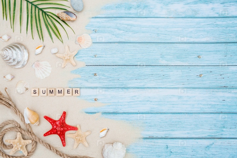 Концепция отдыха на море. Корпуса, соломенная шляпа и надпись «лето» сделаны из деревянных блоков на песке. Предыстория летних каникул с пространством для текста. Вид сверху