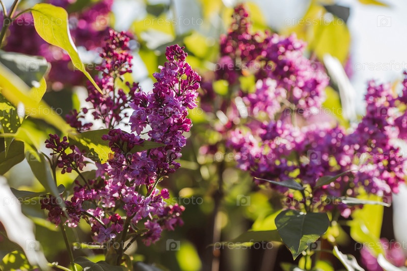 Знамя. Нежный фиолетовый сиреневый цветет в парке. Цветы на закате. Свет от солнца. Близко. Красивый боке на заднем плане