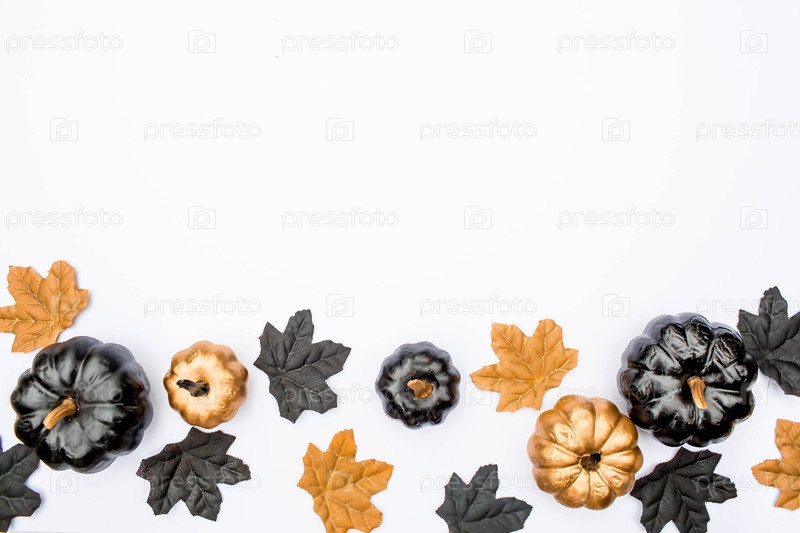 Знамя. Современный фон с летучими мышами, черными и золотыми тыквами, листьями, паутиной, пауками на белом фоне. Хэллоуин с копией для текста. Плоский лед, сверху